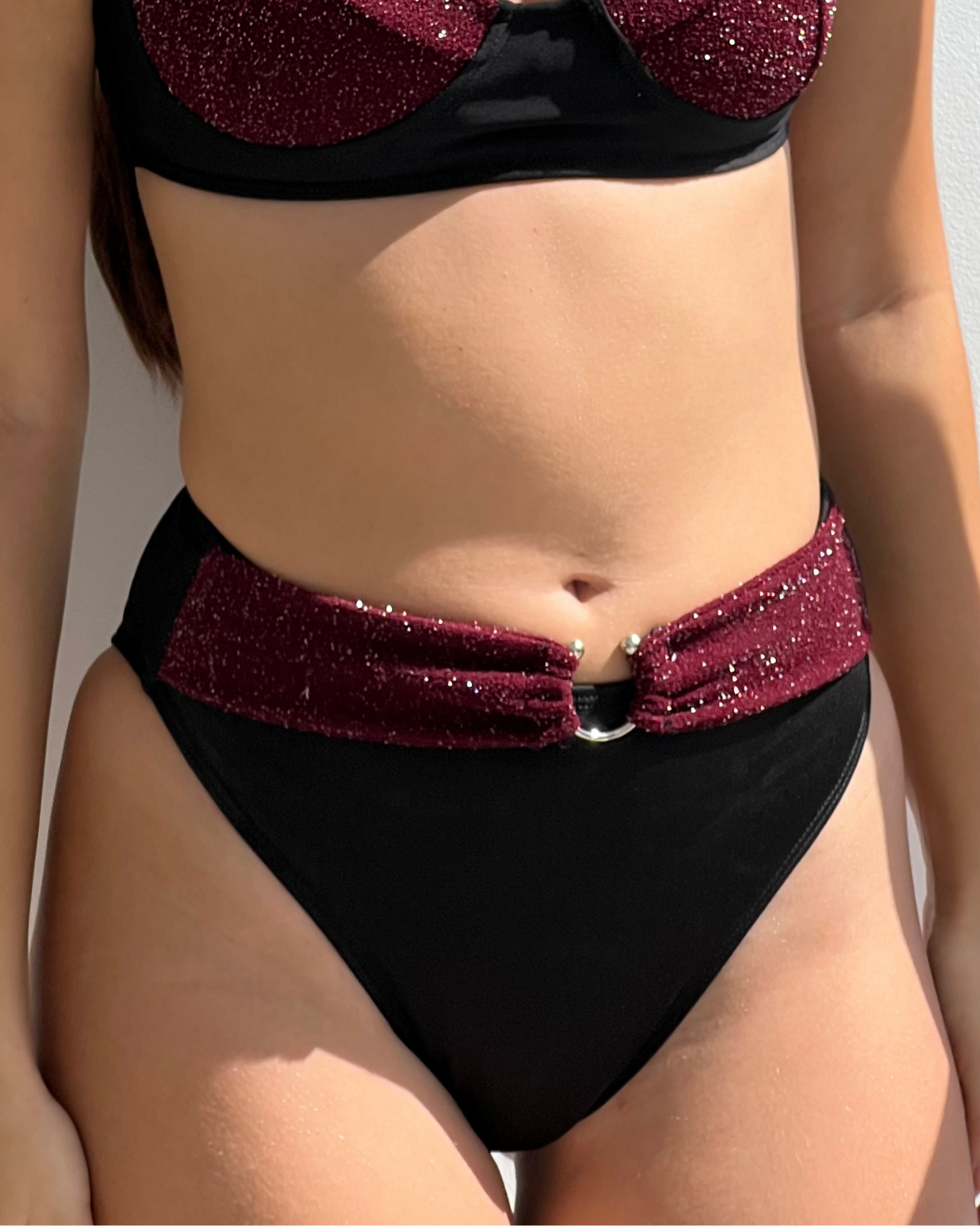 Bikini bottom in solid black stretch knit fabric with a medium-rise cut, featuring a front belt with a red metallic thread pattern and a silver-colored metal buckle. You can wear the bottom higher for a daring look!