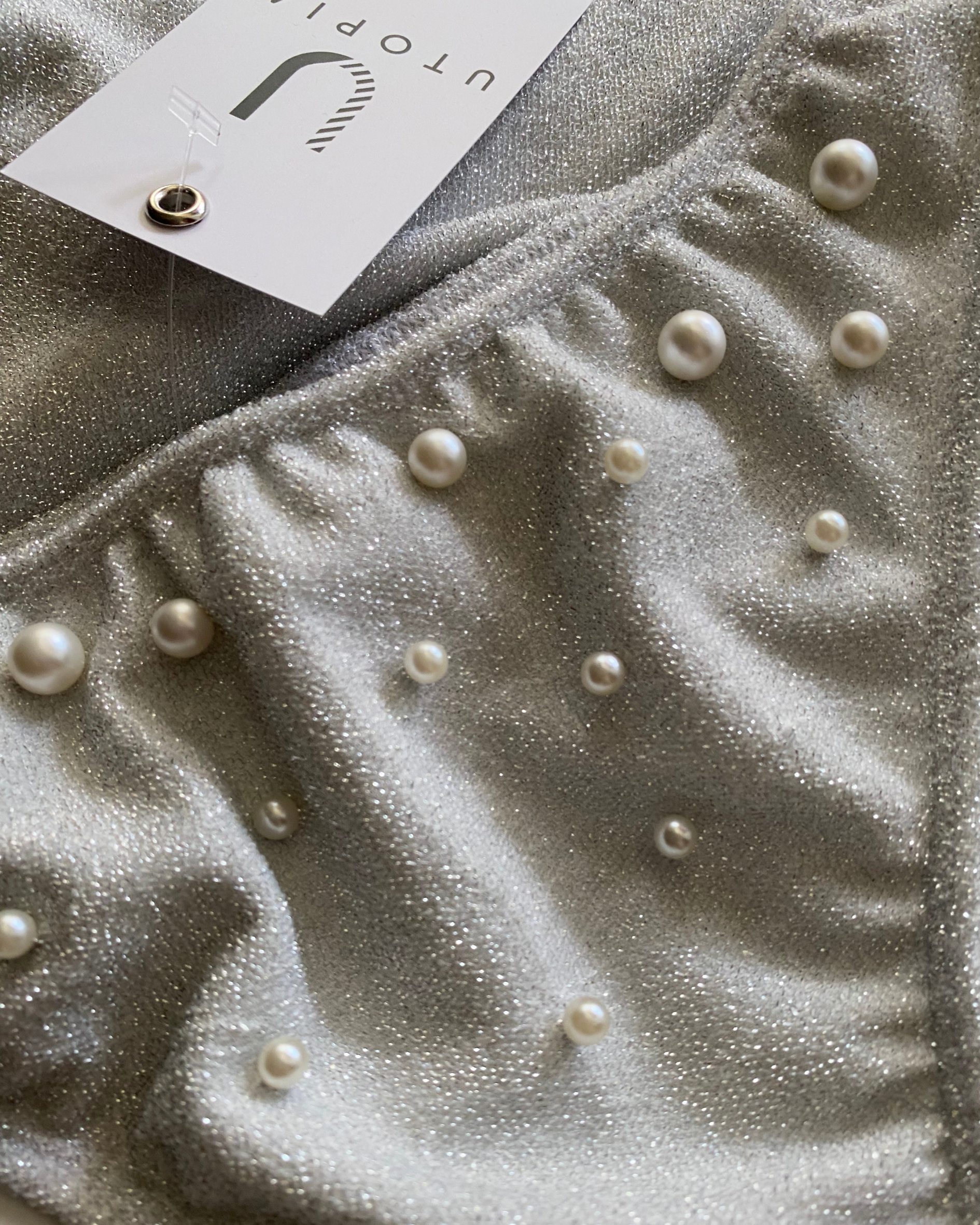 Complete your bridal swim look with the Luna High-Rise Bikini Bottom, crafted in shimmer white fabric with silver metallic threads and delicate pearl accents. Its classic high-waist design offers a flattering, elongating silhouette with just the right amount of coverage, making it a must-have for honeymoon escapes, pre-wedding beach days, or luxury destination weddings.