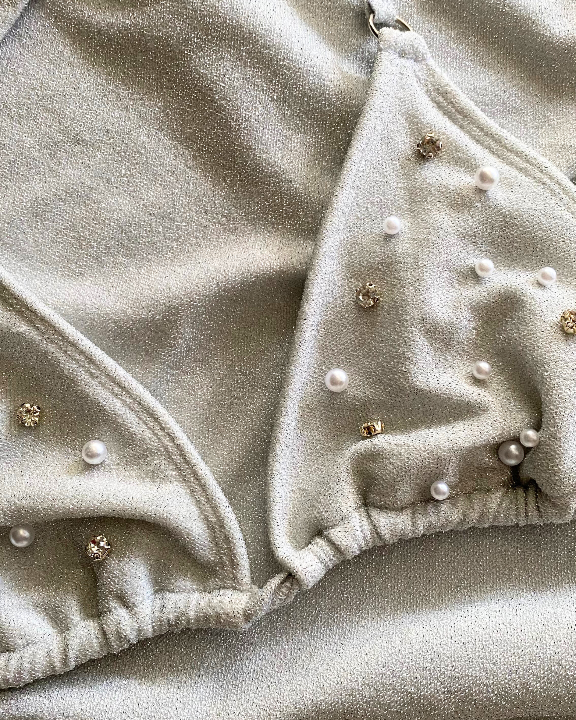 Luna bridal triangle bikini top with shimmer fabric, pearls & rhinestones. Perfect for honeymoons & destination bridal escapes.