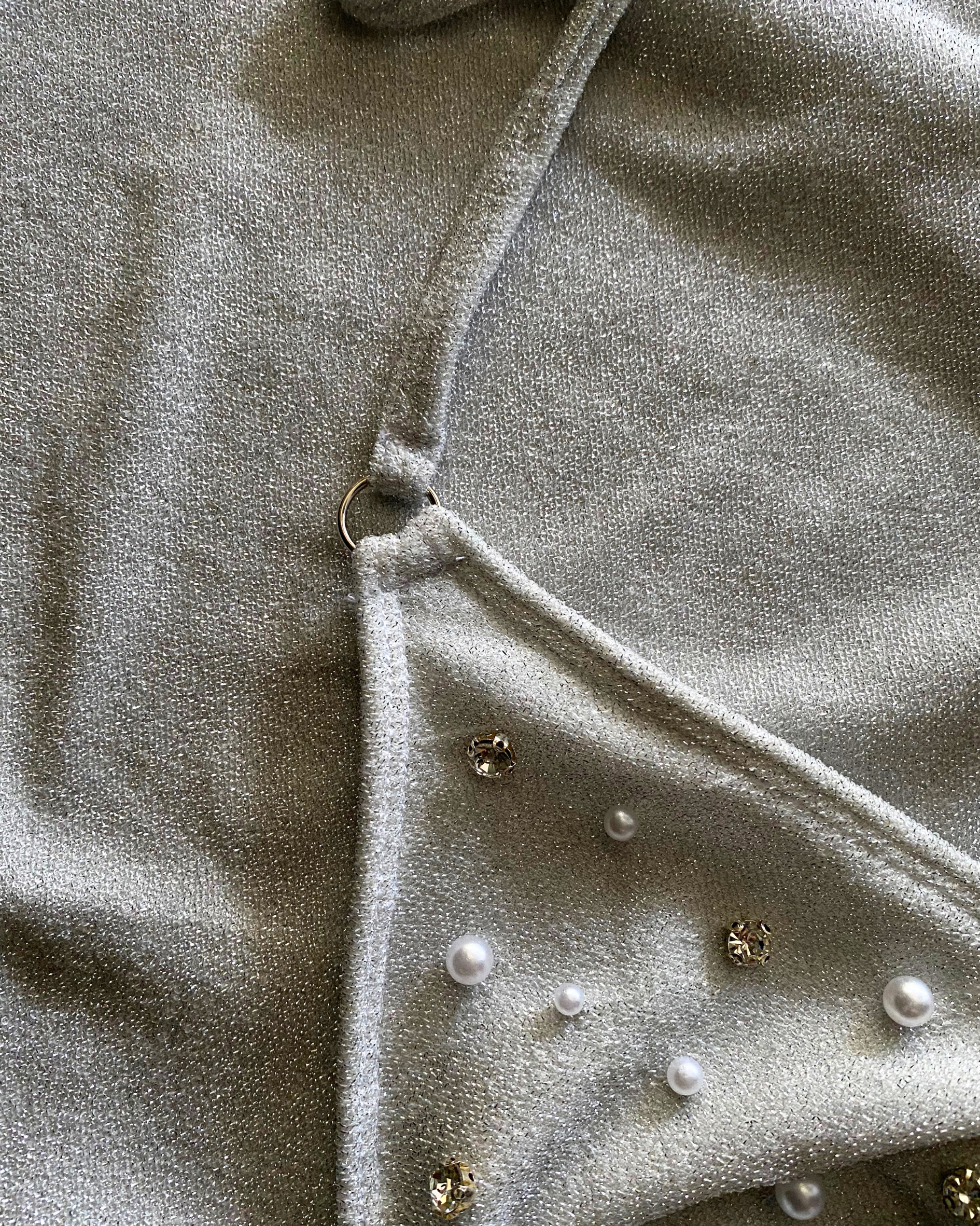 Shine effortlessly in Luna, a bridal triangle bikini top crafted in luxurious silver shimmer fabric with metallic threads. Designed for the modern bride, it features a classic triangle silhouette, adjustable ties for a personalized fit, and delicate pearl and rhinestone embellishments that add a touch of bridal glamour.
